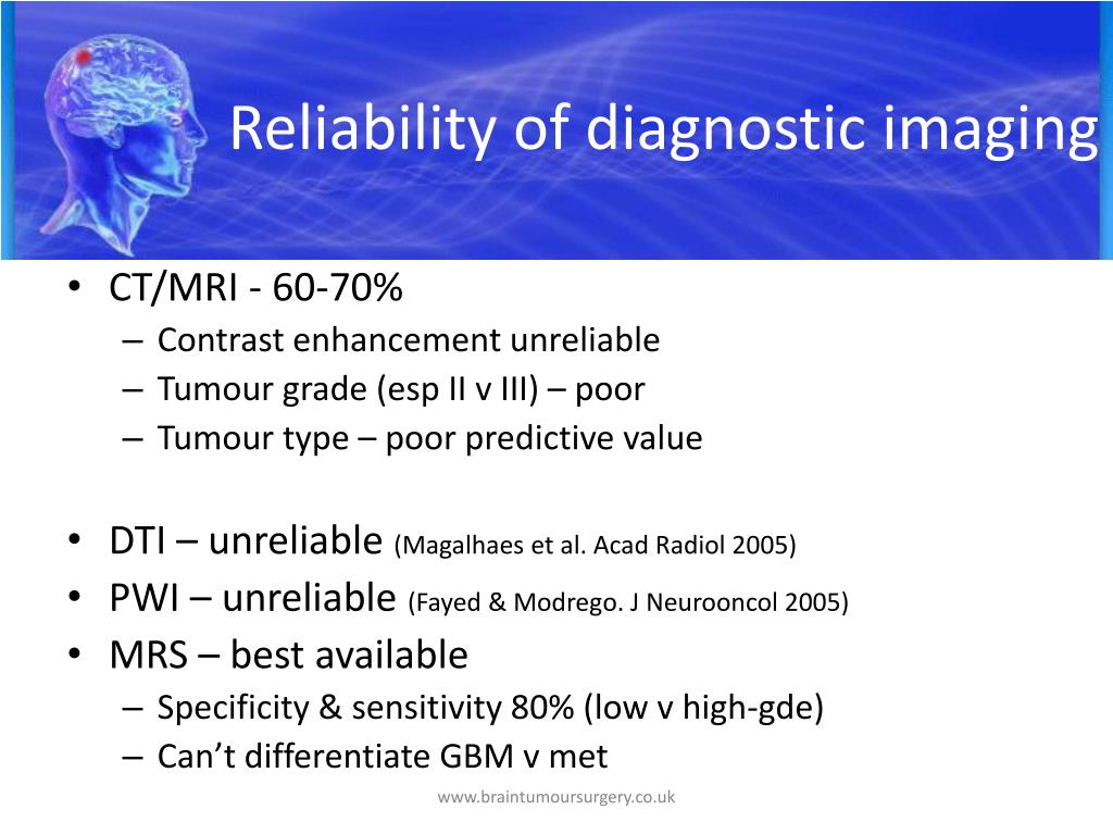Reliability of diagnostic imaging • CT/MRI - 60-70% • Contrast enhancement unreliable • Tumour grade (esp II v III) – poor • Tumour type – poor predictive value • DTI – unreliable (Magalhaes et al. Acad Radiol 2005) • PWI – unreliable (Fayed & Modrego. J Neurooncol 2005) • MRS – best available • Specificity & sensitivity 80% (low v high-gde) • Can’t differentiate GBM v met www.braintumoursurgery.co.uk