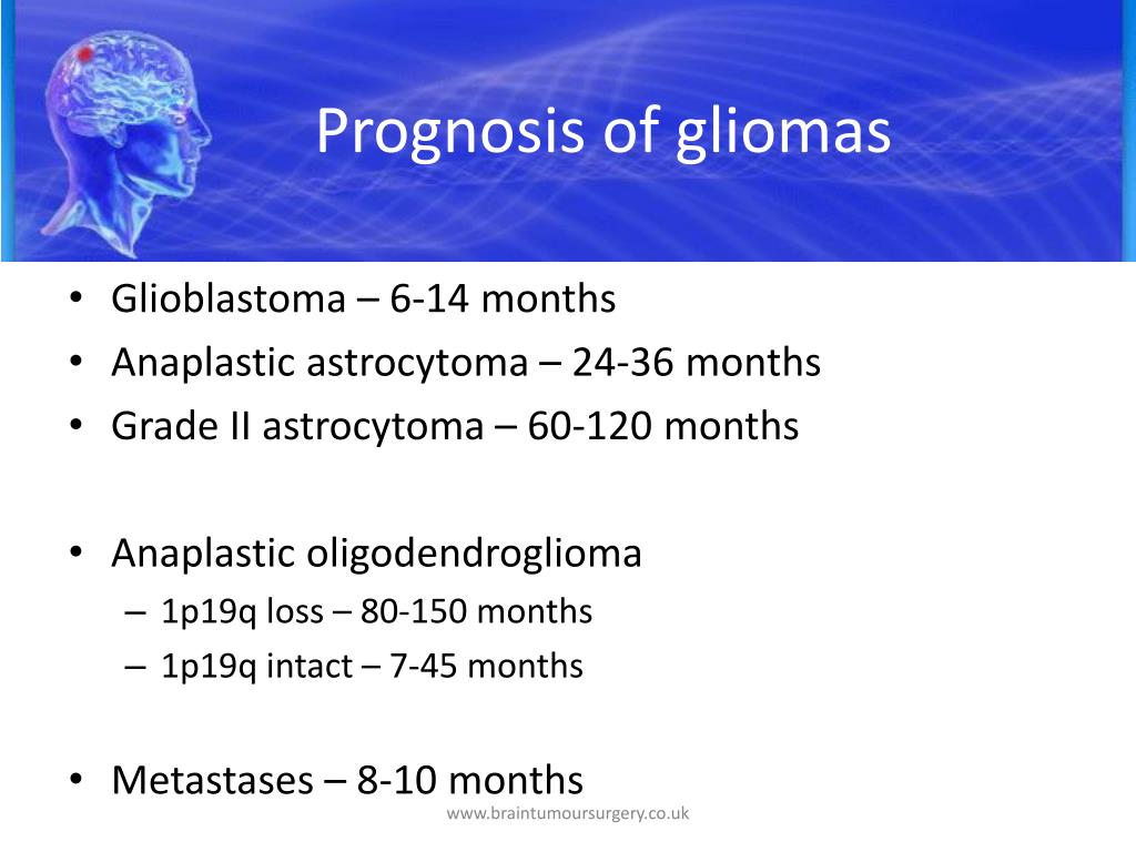 Prognosis of gliomas • Glioblastoma – 6-14 months • Anaplastic astrocytoma – 24-36 months • Grade II astrocytoma – 60-120 months • Anaplastic oligodendroglioma • 1p19q loss – 80-150 months • 1p19q intact – 7-45 months • Metastases – 8-10 months www.braintumoursurgery.co.uk