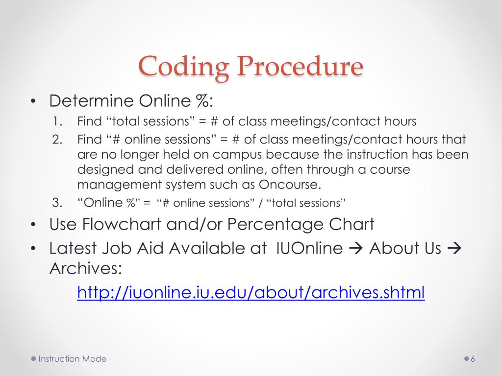 Coding Procedure • Determine Online %: • Find “total sessions” = # of class meetings/contact hours • Find “# online sessions” = # of class meetings/contact hours that are no longer held on campus because the instruction has been designed and delivered online, often through a course management system such as Oncourse. • “Online %” = “# online sessions” / “total sessions” • Use Flowchart and/or Percentage Chart • Latest Job Aid Available at IUOnline About Us Archives: http://iuonline.iu.edu/about/archives.shtml Instruction Mode