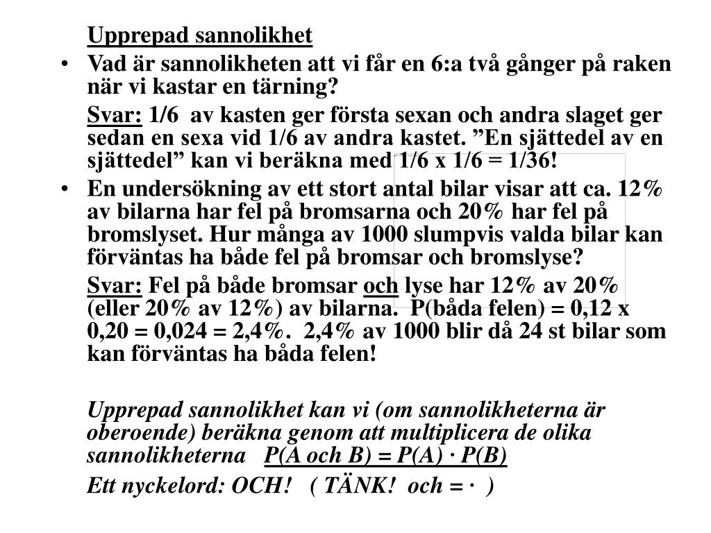 Upprepad sannolikhet • Vad är sannolikheten att vi får en 6:a två gånger på raken när vi kastar en tärning? Svar: 1/6 av kasten ger första sexan och andra slaget ger sedan en sexa vid 1/6 av andra kastet. ”En sjättedel av en sjättedel” kan vi beräkna med 1/6 x 1/6 = 1/36! • En undersökning av ett stort antal bilar visar att ca. 12% av bilarna har fel på bromsarna och 20% har fel på bromslyset. Hur många av 1000 slumpvis valda bilar kan förväntas ha både fel på bromsar och bromslyse? Svar: Fel på både bromsar och lyse har 12% av 20% (eller 20% av 12%) av bilarna. P(båda felen) = 0,12 x 0,20 = 0,024 = 2,4%. 2,4% av 1000 blir då 24 st bilar som kan förväntas ha båda felen! Upprepad sannolikhet kan vi (om sannolikheterna är oberoende) beräkna genom att multiplicera de olika sannolikheterna P(A och B) = P(A) · P(B) Ett nyckelord: OCH! ( TÄNK! och = · )
