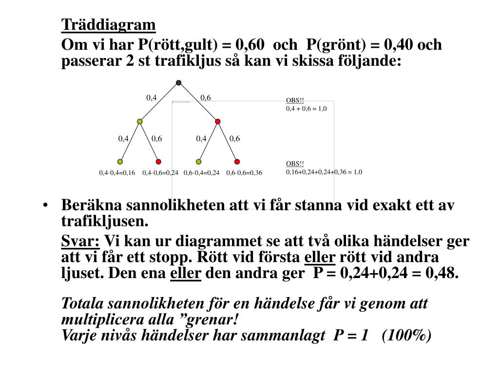 OBS!! 0,4 + 0,6 = 1,0 OBS!! 0,16+0,24+0,24+0,36 = 1,0 0,4 0,6 0,4 0,6 0,4 0,6 0,4·0,4=0,16 0,4·0,6=0,24 0,6·0,4=0,24 0,6·0,6=0,36 Träddiagram Om vi har P(rött,gult) = 0,60 och P(grönt) = 0,40 och passerar 2 st trafikljus så kan vi skissa följande: • Beräkna sannolikheten att vi får stanna vid exakt ett av trafikljusen. Svar: Vi kan ur diagrammet se att två olika händelser ger att vi får ett stopp. Rött vid första eller rött vid andra ljuset. Den ena eller den andra ger P = 0,24+0,24 = 0,48. Totala sannolikheten för en händelse får vi genom att multiplicera alla ”grenar! Varje nivås händelser har sammanlagt P = 1 (100%)