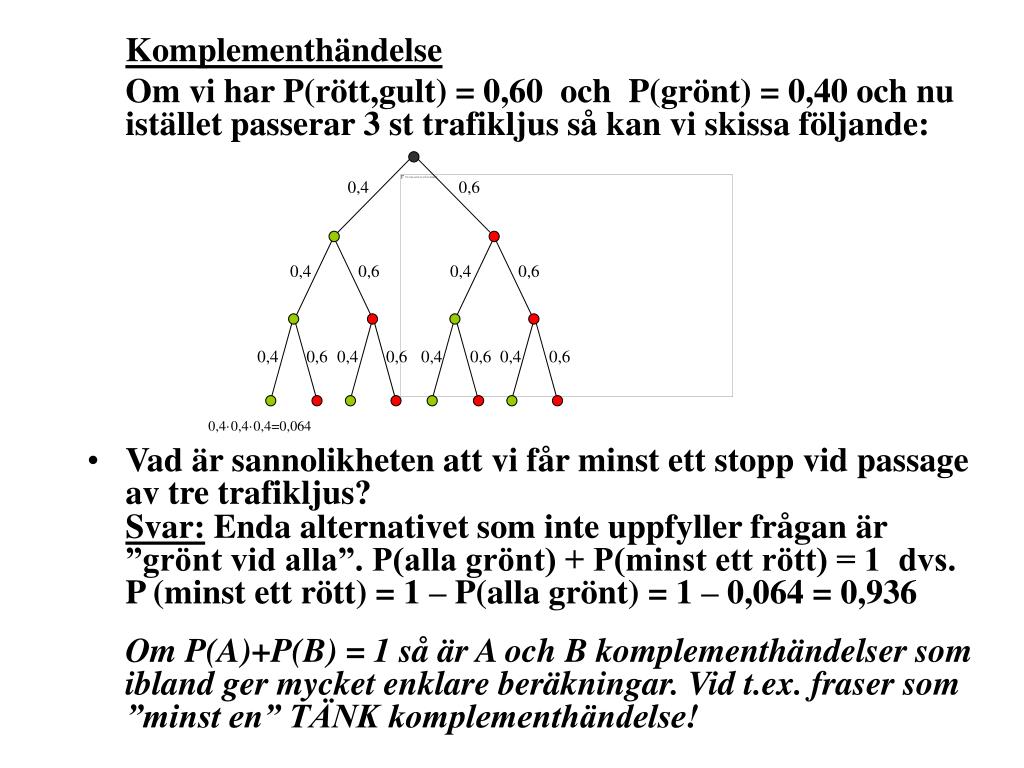 0,4 0,6 0,4 0,6 0,4 0,6 0,4 0,6 0,4 0,6 0,4 0,6 0,4 0,6 Komplementhändelse Om vi har P(rött,gult) = 0,60 och P(grönt) = 0,40 och nu istället passerar 3 st trafikljus så kan vi skissa följande: 0,4·0,4·0,4=0,064 • Vad är sannolikheten att vi får minst ett stopp vid passage av tre trafikljus? Svar: Enda alternativet som inte uppfyller frågan är ”grönt vid alla”. P(alla grönt) + P(minst ett rött) = 1 dvs. P (minst ett rött) = 1 – P(alla grönt) = 1 – 0,064 = 0,936 Om P(A)+P(B) = 1 så är A och B komplementhändelser som ibland ger mycket enklare beräkningar. Vid t.ex. fraser som ”minst en” TÄNK komplementhändelse!