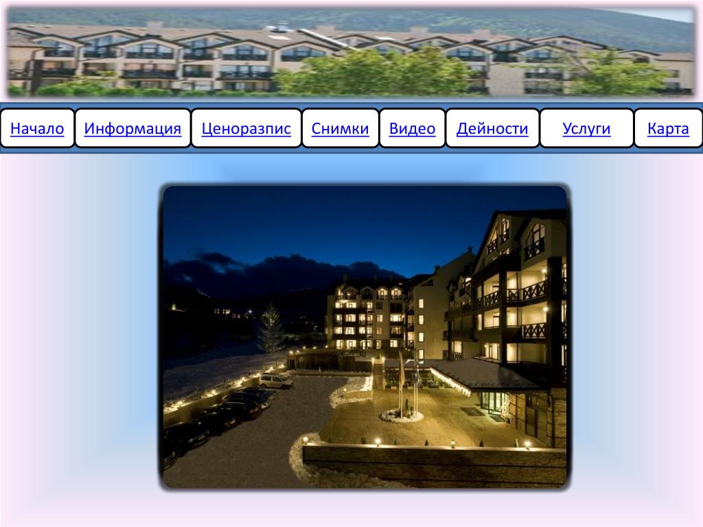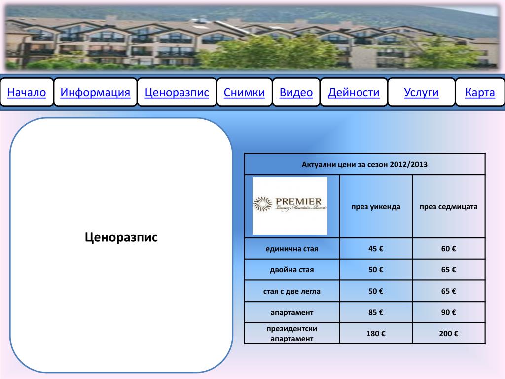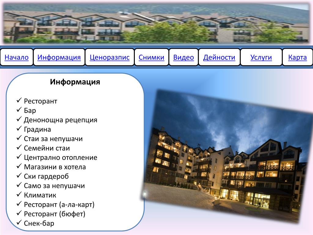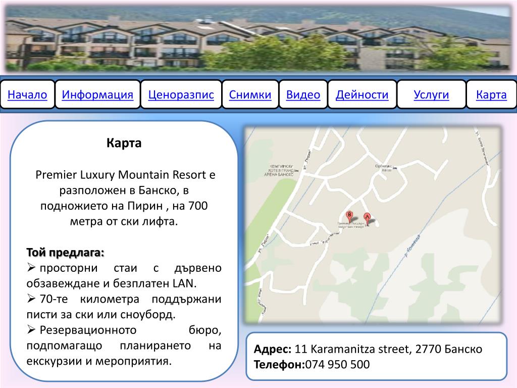 Начало. Информация. Ценоразпис. Снимки. Видео. Дейности. Услуги. Карта. Премиер Лъкшъри Маунтайн Ризорт (Premier Luxury Mountain Resort). Начало. Информация. Ценоразпис. Снимки. Видео. Дейности. Услуги. Карта. Информация Ресторант Бар Денонощна рецепция Градина