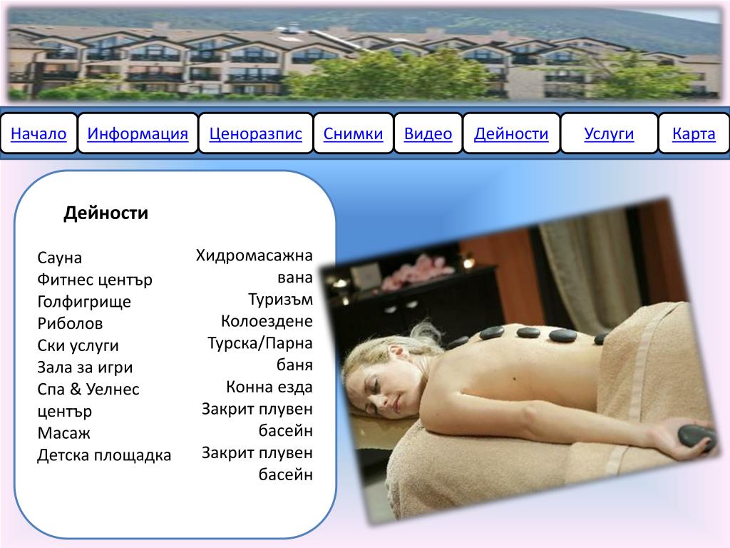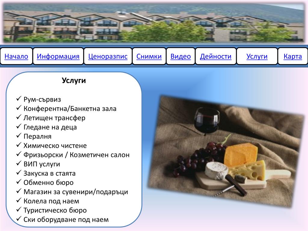 Начало Информация Ценоразпис Снимки Видео Дейности Услуги Карта