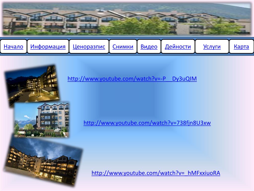 Начало Информация Ценоразпис Снимки Видео Дейности Услуги Карта http://www.youtube.com/watch?v=-P__Dy3uQIM http://www.youtube.com/watch?v=738fjn8U3xw http://www.youtube.com/watch?v=_hMFxxiuoRA