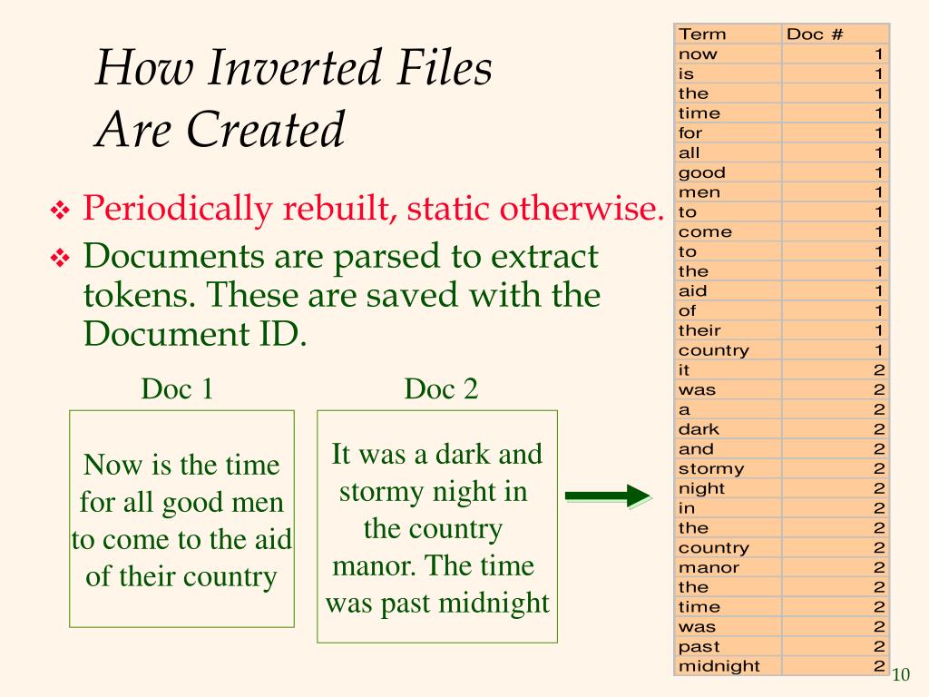 How Inverted Files Are Created • Periodically rebuilt, static otherwise. • Documents are parsed to extract tokens. These are saved with the Document ID. Doc 1 Doc 2 Now is the time for all good men to come to the aid of their country It was a dark and stormy night in the country manor. The time was past midnight
