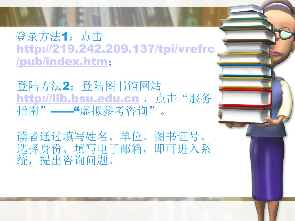 登录方法1:点击http://219.242.209.137/tpi/vrefrc/pub/index.htm;登陆方法2:登陆图书馆网站http://lib.bsu.edu.cn,点击“服务指南”——“虚拟参考咨询”。读者通过填写姓名、单位、图书证号、选择身份、填写电子邮箱,即可进入系统,提出咨询问题。登录方法1:点击http://219.242.209.137/tpi/vrefrc/pub/index.htm;登陆方法2:登陆图书馆网站http://lib.bsu.edu.cn,点击“服务指南”——“虚拟参考咨询”。读者通过填写姓名、单位、图书证号、选择身份、填写电子邮箱,即可进入系统,提出咨询问题。