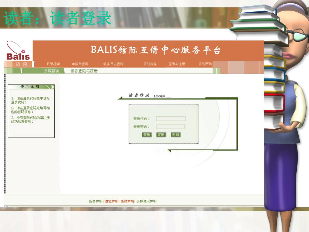 二、馆际互借 • BALIS馆际互借中心是北京地区高等教育 • 文献保障系统(BALIS)下设的原文传递、馆 际 • 互借、资源协调、培训四个中心之一,于2007 • 年11月正式启动。该中心的建设目的是:在北 • 京地区高校图工委的统一领导下,采用集中式门 • 户平台和分布式 服务相结合的方式,充分利用 • 北京高校丰富的馆藏资源和便捷的网络环境,为 • 北京地区高校读者提供馆际互借服务。