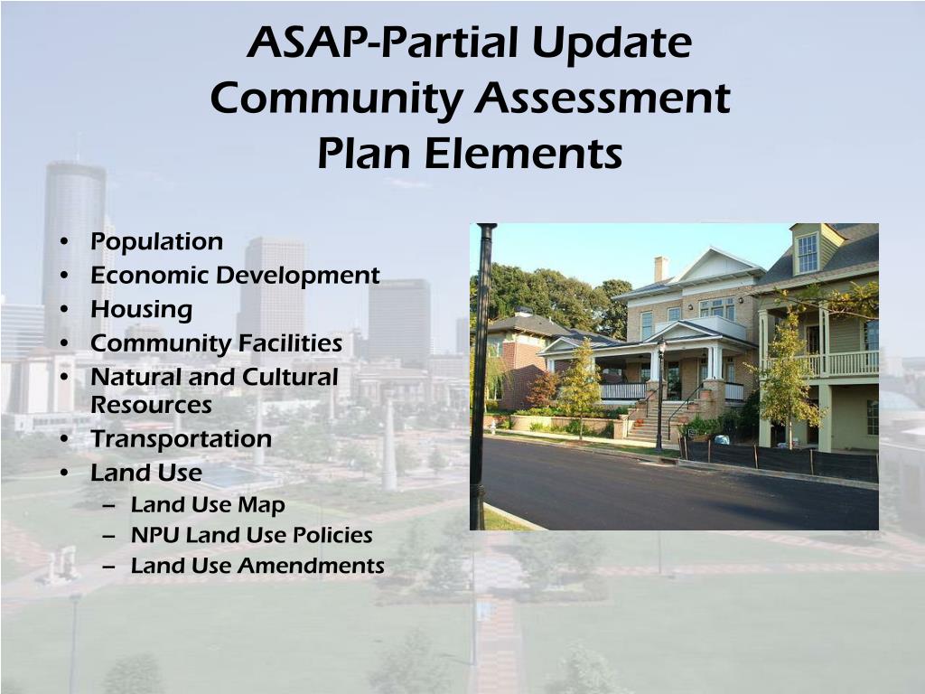 ASAP-Partial UpdateCommunity AssessmentPlan Elements • Population • Economic Development • Housing • Community Facilities • Natural and Cultural Resources • Transportation • Land Use • Land Use Map • NPU Land Use Policies • Land Use Amendments