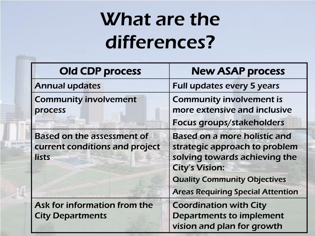 ASAP- Background • May 2005, Georgia State Department of Community Affairs (DCA) adopted new guidelines/requirements for local government comprehensive planning Among other things: • It requires additional components to be included in the new comprehensive planning process. No components were removed. • There is a shift in focus toward community input, qualitygrowth and policy making. • Plan will enhance decision making & will be a policy guide for the City of Atlanta and its neighborhoods.