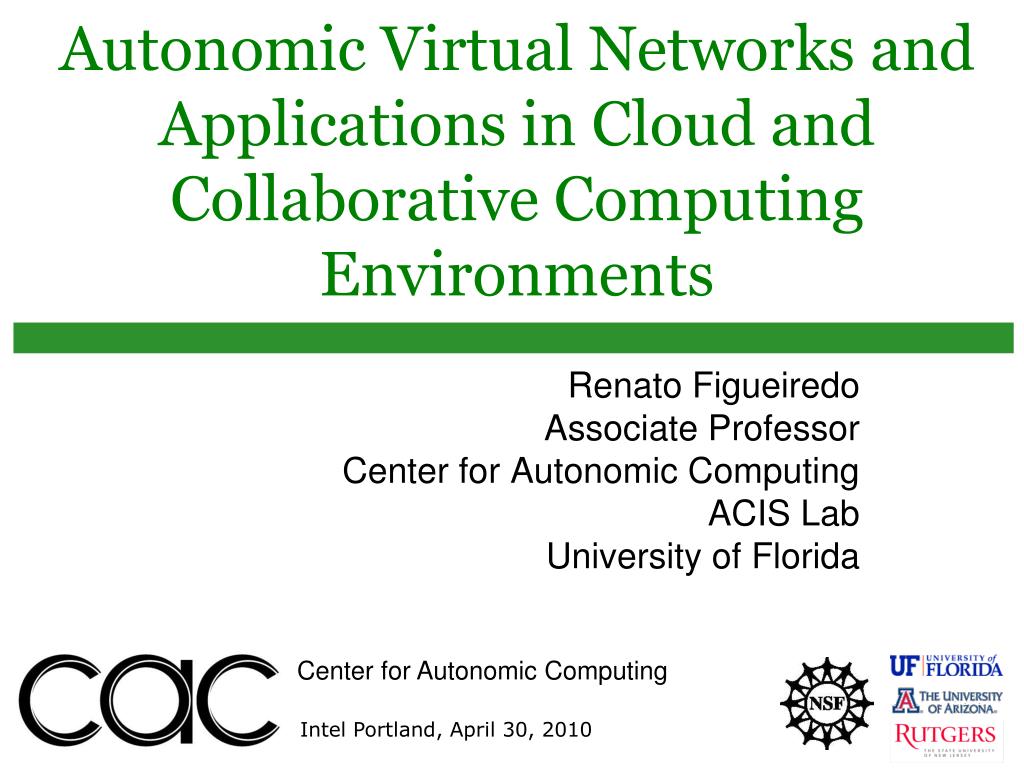 Autonomic Virtual Networks and Applications in Cloud and Collaborative Computing Environments. Renato Figueiredo Associate Professor Center for Autonomic Computing ACIS Lab University of Florida. Outlook. Architecting autonomic virtual networks
