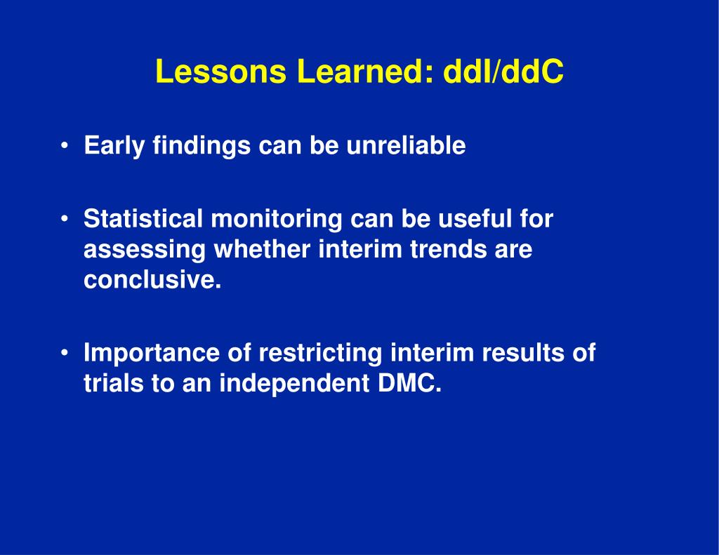 Lessons Learned: ddI/ddC • Early findings can be unreliable • Statistical monitoring can be useful for assessing whether interim trends are conclusive. • Importance of restricting interim results of trials to an independent DMC.