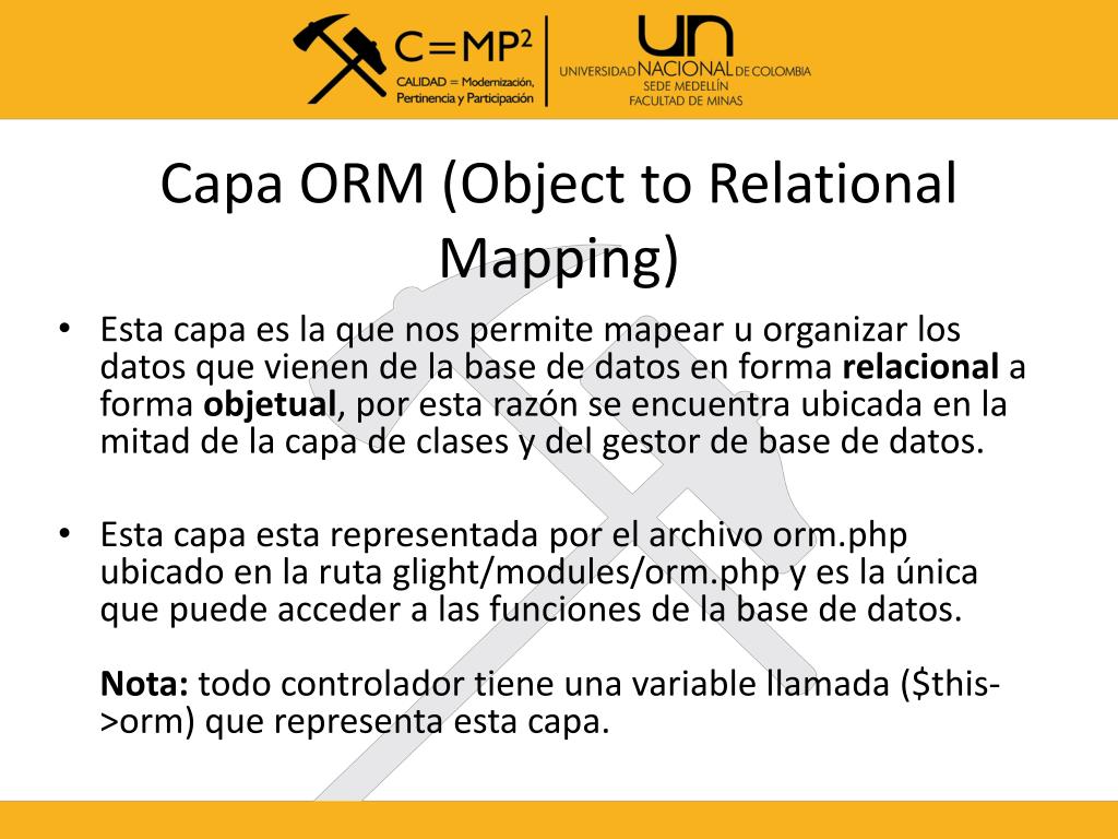 Capa ORM (ObjecttoRelationalMapping) • Esta capa es la que nos permite mapear u organizar los datos que vienen de la base de datos en forma relacional a forma objetual, por esta razón se encuentra ubicada en la mitad de la capa de clases y del gestor de base de datos. • Esta capa esta representada por el archivo orm.php ubicado en la ruta glight/modules/orm.php y es la única que puede acceder a las funciones de la base de datos.Nota: todo controlador tiene una variable llamada ($this->orm) que representa esta capa.
