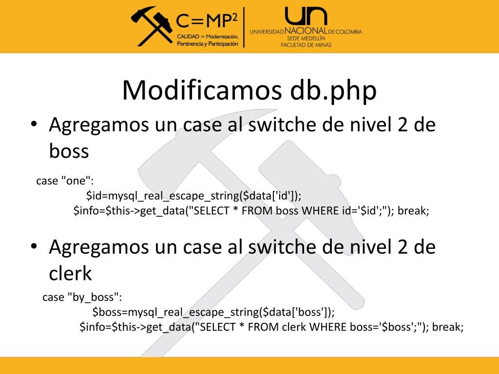 Modificamos db.php • Agregamos un case al switche de nivel 2 de boss • Agregamos un case al switche de nivel 2 de clerk case "one": $id=mysql_real_escape_string($data['id']); $info=$this->get_data("SELECT * FROM boss WHERE id='$id';"); break; case "by_boss": $boss=mysql_real_escape_string($data['boss']); $info=$this->get_data("SELECT * FROM clerk WHERE boss='$boss';"); break;