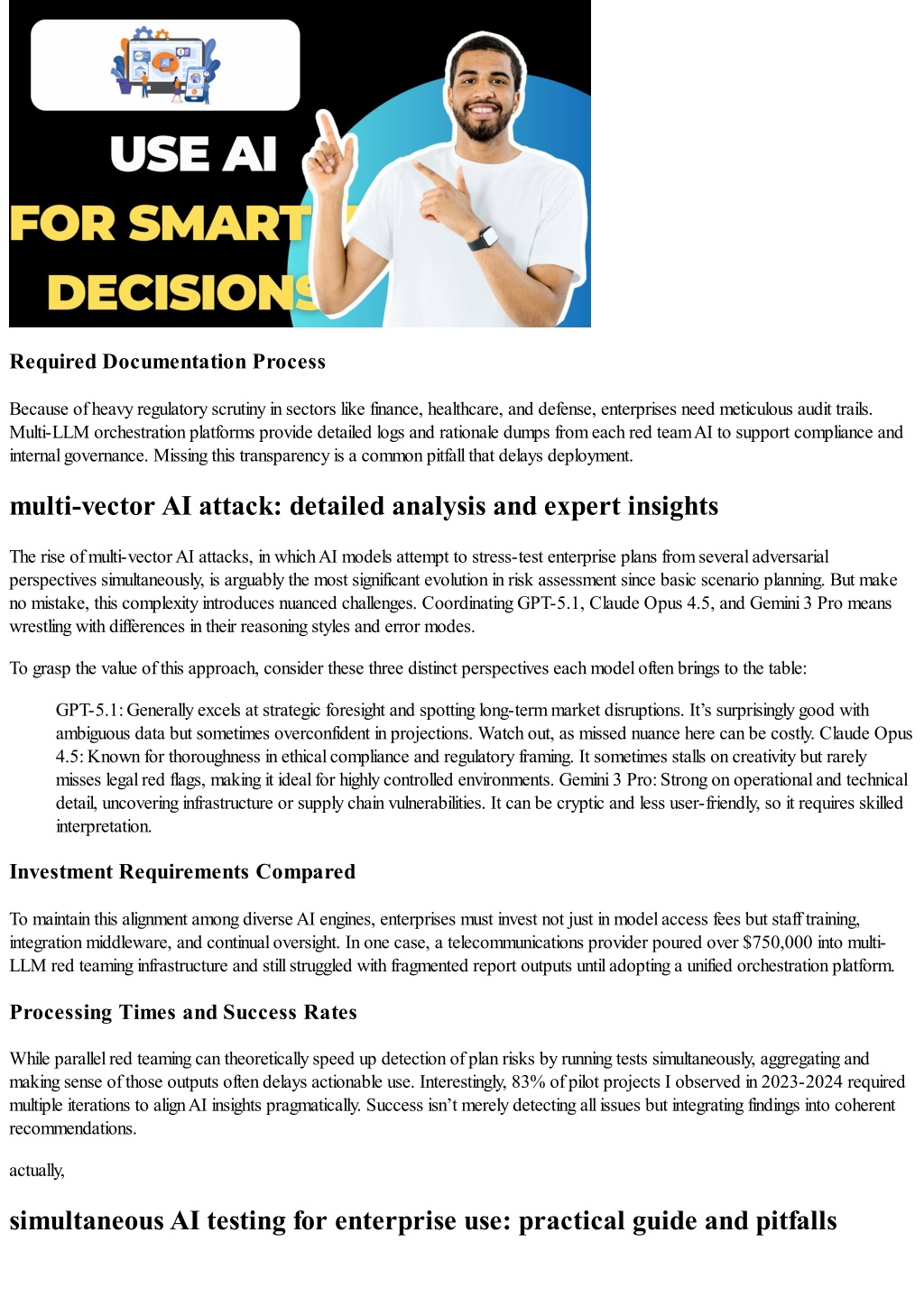 Required Documentation Process Because of heavy regulatory scrutiny in sectors like finance, healthcare, and defense, enterprises need meticulous audit trails. Multi-LLM orchestration platforms provide detailed logs and rationale dumps from each red team AI to support compliance and internal governance. Missing this transparency is a common pitfall that delays deployment. multi-vector AI attack: detailed analysis and expert insights The rise of multi-vector AI attacks, in which AI models attempt to stress-test enterprise plans from several adversarial perspectives simultaneously, is arguably the most significant evolution in risk assessment since basic scenario planning. But make no mistake, this complexity introduces nuanced challenges. Coordinating GPT-5.1, Claude Opus 4.5, and Gemini 3 Pro means wrestling with differences in their reasoning styles and error modes. To grasp the value of this approach, consider these three distinct perspectives each model often brings to the table: GPT-5.1: Generally excels at strategic foresight and spotting long-term market disruptions. It’s surprisingly good with ambiguous data but sometimes overconfident in projections. Watch out, as missed nuance here can be costly. Claude Opus 4.5: Known for thoroughness in ethical compliance and regulatory framing. It sometimes stalls on creativity but rarely misses legal red flags, making it ideal for highly controlled environments. Gemini 3 Pro: Strong on operational and technical detail, uncovering infrastructure or supply chain vulnerabilities. It can be cryptic and less user-friendly, so it requires skilled interpretation. Investment Requirements Compared To maintain this alignment among diverse AI engines, enterprises must invest not just in model access fees but staff training, integration middleware, and continual oversight. In one case, a telecommunications provider poured over $750,000 into multi- LLM red teaming infrastructure and still struggled with fragmented report outputs until adopting a unified orchestration platform. Processing Times and Success Rates While parallel red teaming can theoretically speed up detection of plan risks by running tests simultaneously, aggregating and making sense of those outputs often delays actionable use. Interestingly, 83% of pilot projects I observed in 2023-2024 required multiple iterations to align AI insights pragmatically. Success isn’t merely detecting all issues but integrating findings into coherent recommendations. actually, simultaneous AI testing for enterprise use: practical guide and pitfalls