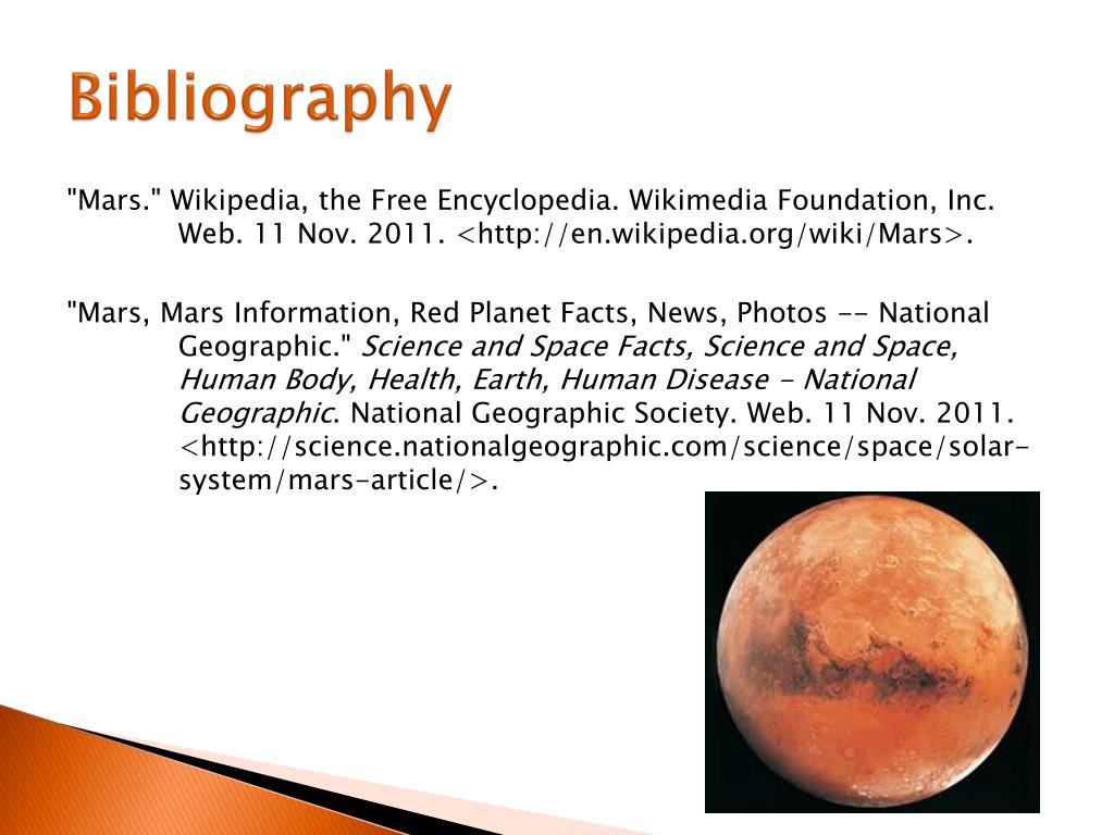 Bibliography "Mars." Wikipedia, the Free Encyclopedia. Wikimedia Foundation, Inc. Web. 11 Nov. 2011. <http://en.wikipedia.org/wiki/Mars>. "Mars, Mars Information, Red Planet Facts, News, Photos -- National Geographic." Science and Space Facts, Science and Space, Human Body, Health, Earth, Human Disease - National Geographic. National Geographic Society. Web. 11 Nov. 2011. <http://science.nationalgeographic.com/science/space/solar-system/mars-article/>.
