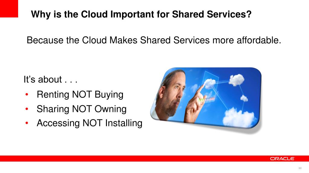 Why is the Cloud Important for Shared Services? Because the Cloud Makes Shared Services more affordable. It’s about . . . • Renting NOT Buying • Sharing NOT Owning • Accessing NOT Installing