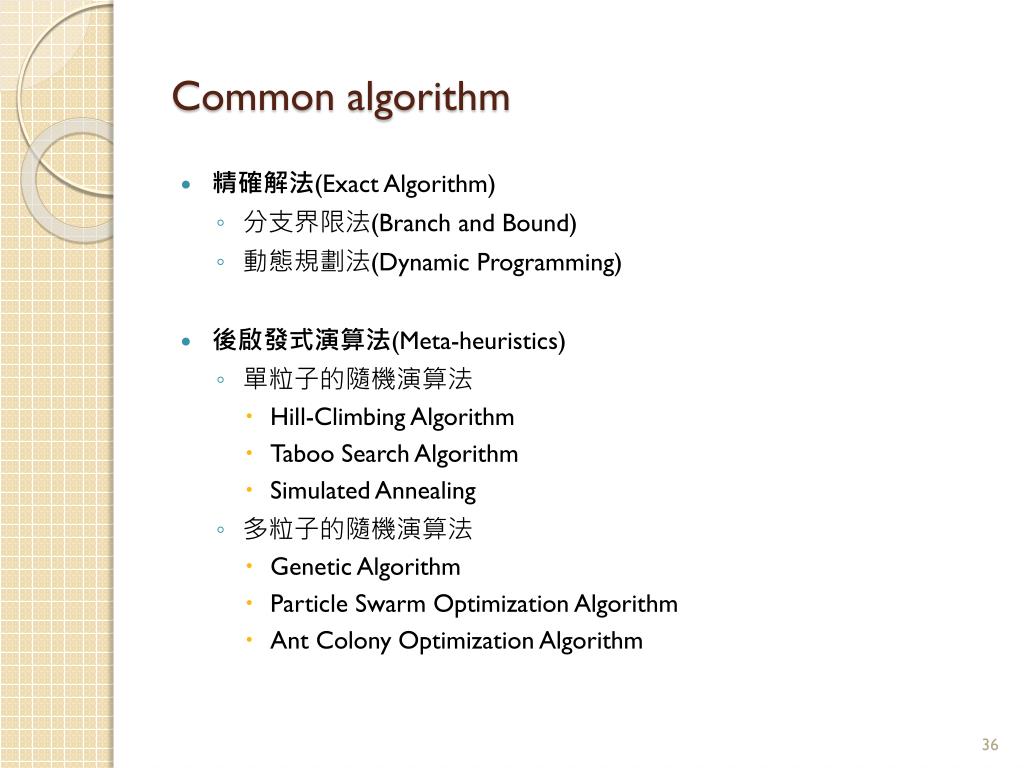 Common algorithm • 精確解法(Exact Algorithm) • 分支界限法(Branch and Bound) • 動態規劃法(Dynamic Programming) • 後啟發式演算法(Meta-heuristics) • 單粒子的隨機演算法 • Hill-Climbing Algorithm • Taboo Search Algorithm • Simulated Annealing • 多粒子的隨機演算法 • Genetic Algorithm • Particle Swarm Optimization Algorithm • Ant Colony Optimization Algorithm