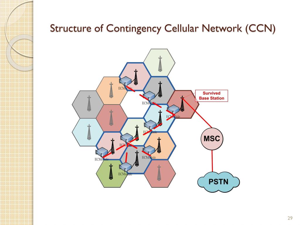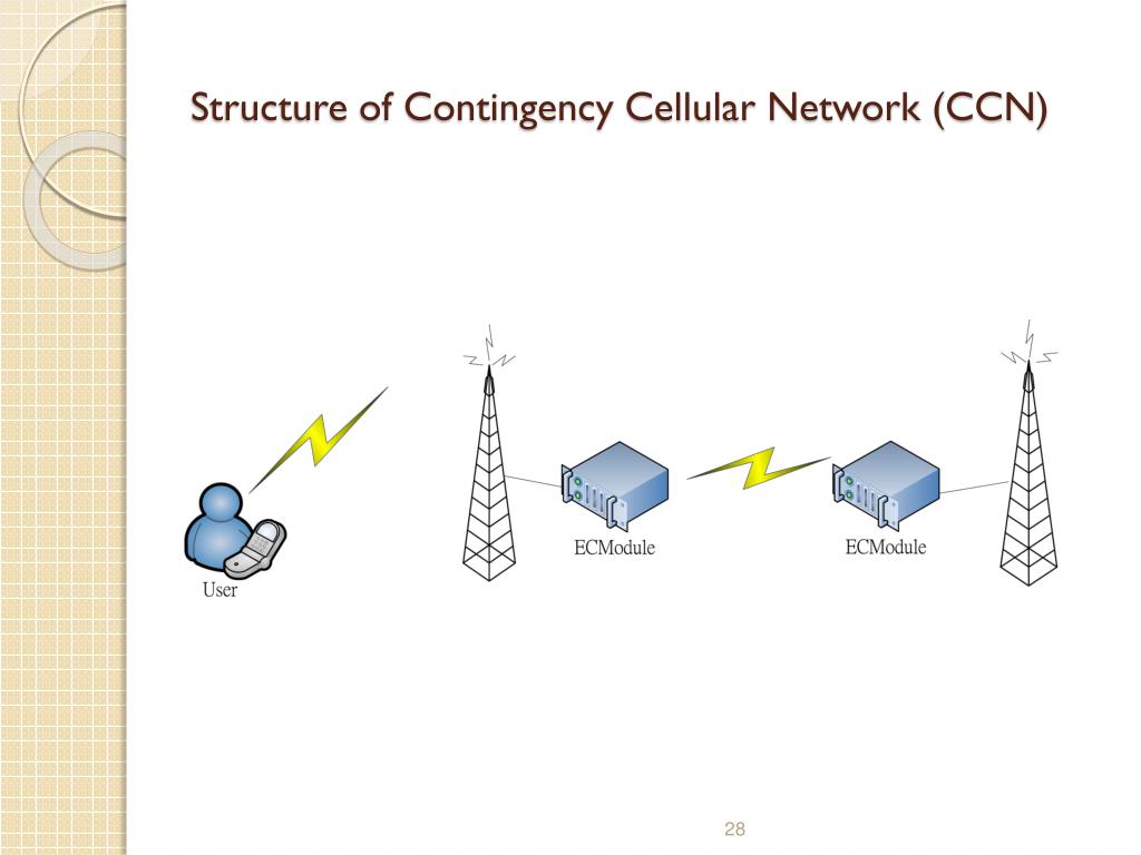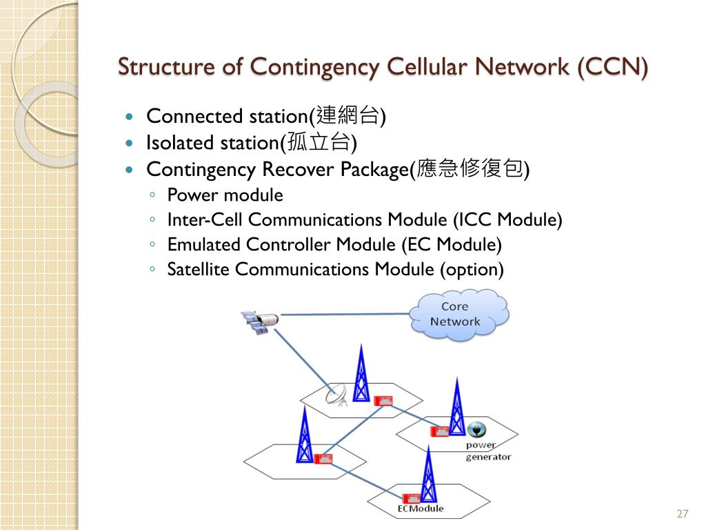 Structure of Contingency Cellular Network (CCN) • Connected station(連網台) • Isolated station(孤立台) • Contingency Recover Package(應急修復包) • Power module • Inter-Cell Communications Module (ICC Module) • Emulated Controller Module (EC Module) • Satellite Communications Module (option)