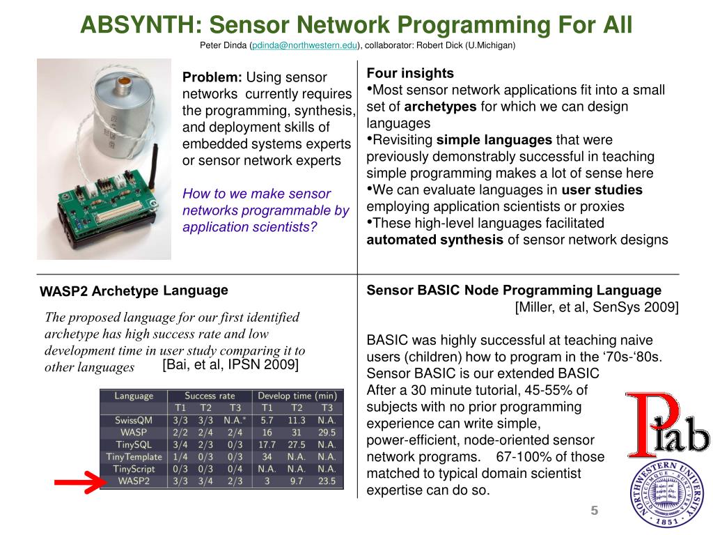 ABSYNTH: Sensor Network Programming For All Peter Dinda (pdinda@northwestern.edu), collaborator: Robert Dick (U.Michigan) • Four insights • Most sensor network applications fit into a small set of archetypes for which we can design languages • Revisiting simple languages that were previously demonstrably successful in teaching simple programming makes a lot of sense here • We can evaluate languages in user studies employing application scientists or proxies • These high-level languages facilitated automated synthesis of sensor network designs Problem: Using sensor networks currently requires the programming, synthesis, and deployment skills of embedded systems experts or sensor network experts How to we make sensor networks programmable by application scientists? WASP2 Archetype Language Sensor BASIC Node Programming Language BASIC was highly successful at teaching naive users (children) how to program in the ‘70s-‘80s.Sensor BASIC is our extended BASICAfter a 30 minute tutorial, 45-55% of subjects with no prior programmingexperience can write simple, power-efficient, node-oriented sensornetwork programs. 67-100% of those matched to typical domain scientistexpertise can do so. [Miller, et al, SenSys 2009] The proposed language for our first identified archetype has high success rate and low development time in user study comparing it to other languages [Bai, et al, IPSN 2009] 5