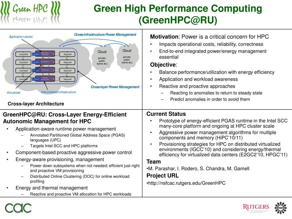 Green High Performance Computing (GreenHPC@RU) Cross-layer Architecture GreenHPC@RU: Cross-Layer Energy-Efficient Autonomic Management for HPC • Application-aware runtime power management • Annotated Partitioned Global Address Space (PGAS) languages (UPC) • Targets Intel SCC and HPC platforms • Component-based proactive aggressive power control • Energy-aware provisioning, management • Power down subsystems when not needed; efficient just-right and proactive VM provisioning • Distributed Online Clustering (DOC) for online workload profiling • Energy and thermal management • Reactive and proactive VM allocation for HPC workloads Current Status • Prototype of energy-efficient PGAS runtime in the Intel SCC many-core platform and ongoing at HPC cluster scale • Aggressive power management algorithms for multiple components and memory (HiPC’10/11) • Provisioning strategies for HPC on distributed virtualized environments (IGCC’10) and considering energy/thermal efficiency for virtualized data centers (E2GC2’10, HPGC’11) Team M. Parashar, I. Rodero, S. Chandra, M. Gamell Project URL http://nsfcac.rutgers.edu/GreenHPC Motivation: Power is a critical concern for HPC Impacts operational costs, reliability, correctness End-to-end integrated power/energy management essential Objective: Balance performance/utilization with energy efficiency Application and workload awareness Reactive and proactive approaches • Reacting to anomalies to return to steady state • Predict anomalies in order to avoid them