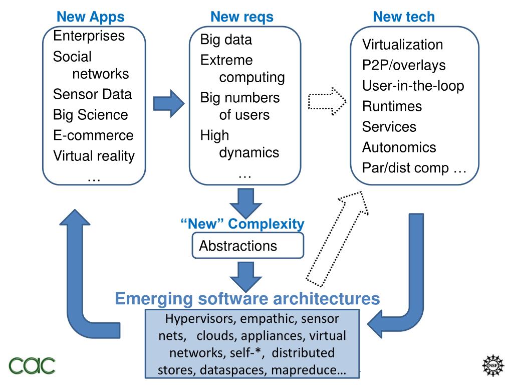 New Apps New reqs New tech • Enterprises • Social networks • Sensor Data • Big Science • E-commerce • Virtual reality • … • Big data • Extreme computing • Big numbers of users • High dynamics • … • Virtualization • P2P/overlays • User-in-the-loop • Runtimes • Services • Autonomics • Par/dist comp … “New” Complexity • Abstractions Emerging software architectures Hypervisors, empathic, sensor nets, clouds, appliances, virtual networks, self-*, distributed stores, dataspaces, mapreduce…