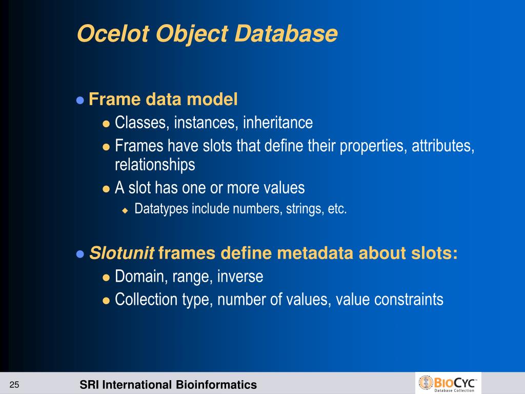 Ocelot Object Database • Frame data model • Classes, instances, inheritance • Frames have slots that define their properties, attributes, relationships • A slot has one or more values • Datatypes include numbers, strings, etc. • Slotunit framesdefine metadata about slots: • Domain, range, inverse • Collection type, number of values, value constraints