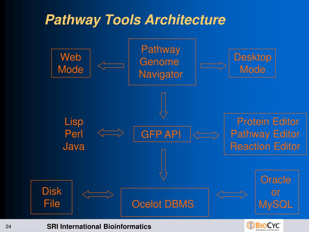 Pathway Tools Architecture Pathway Genome Navigator Web Mode Desktop Mode Lisp Perl Java Protein Editor Pathway Editor Reaction Editor GFP API Oracle or MySQL Disk File Ocelot DBMS