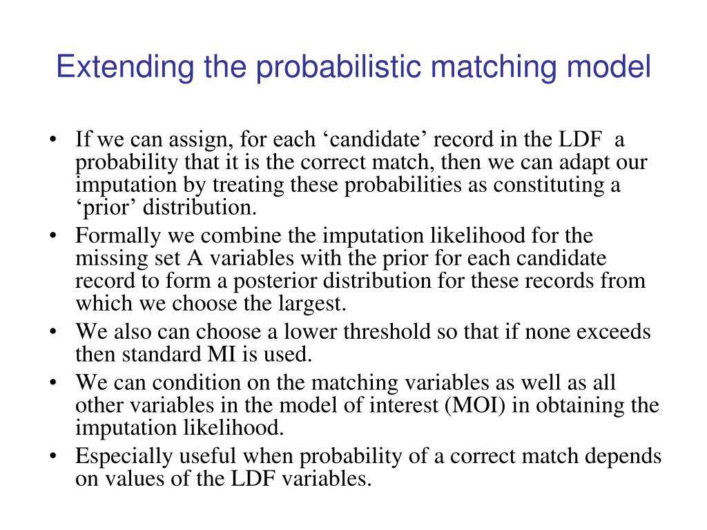 Extending the probabilistic matching model • If we can assign, for each ‘candidate’ record in the LDF a probability that it is the correct match, then we can adapt our imputation by treating these probabilities as constituting a ‘prior’ distribution. • Formally we combine the imputation likelihood for the missing set A variables with the prior for each candidate record to form a posterior distribution for these records from which we choose the largest. • We also can choose a lower threshold so that if none exceeds then standard MI is used. • We can condition on the matching variables as well as all other variables in the model of interest (MOI) in obtaining the imputation likelihood. • Especially useful when probability of a correct match depends on values of the LDF variables.