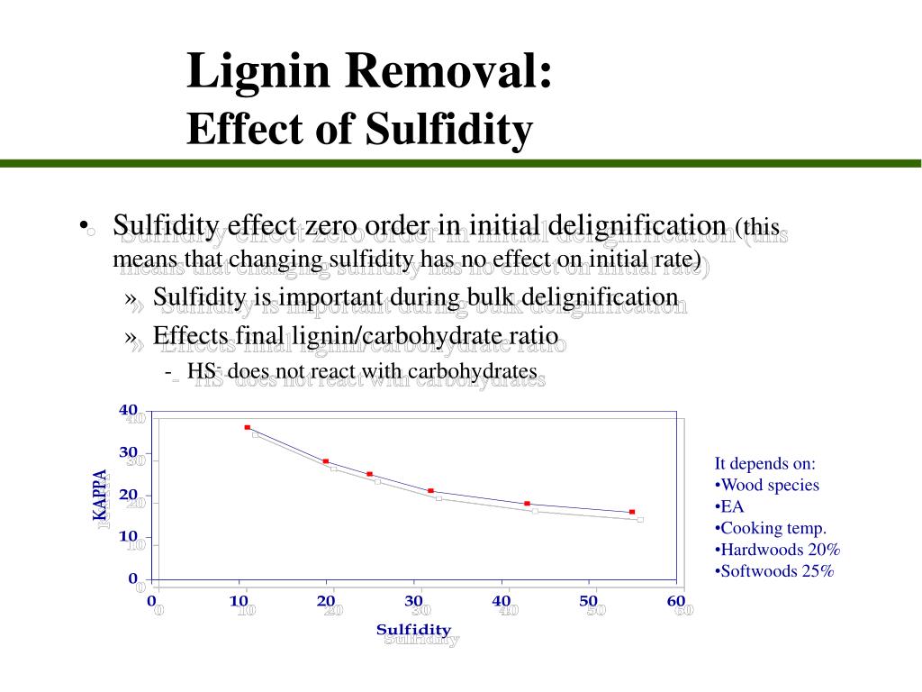 Lignin Removal:Effect of Sulfidity • Sulfidity effect zero order in initial delignification (this means that changing sulfidity has no effect on initial rate) • Sulfidity is important during bulk delignification • Effects final lignin/carbohydrate ratio • HS- does not react with carbohydrates • It depends on: • Wood species • EA • Cooking temp. • Hardwoods 20% • Softwoods 25%