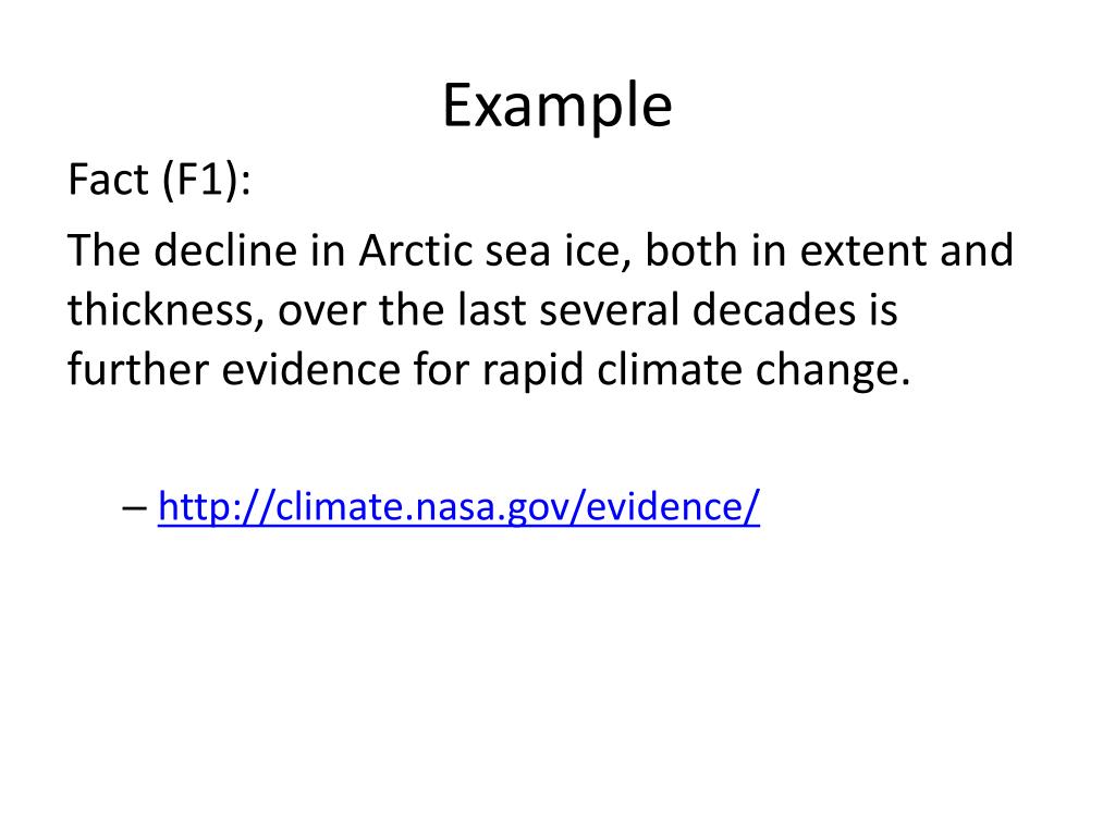 Example Fact (F1): The decline in Arctic sea ice, both in extent and thickness, over the last several decades is further evidence for rapid climate change. • http://climate.nasa.gov/evidence/