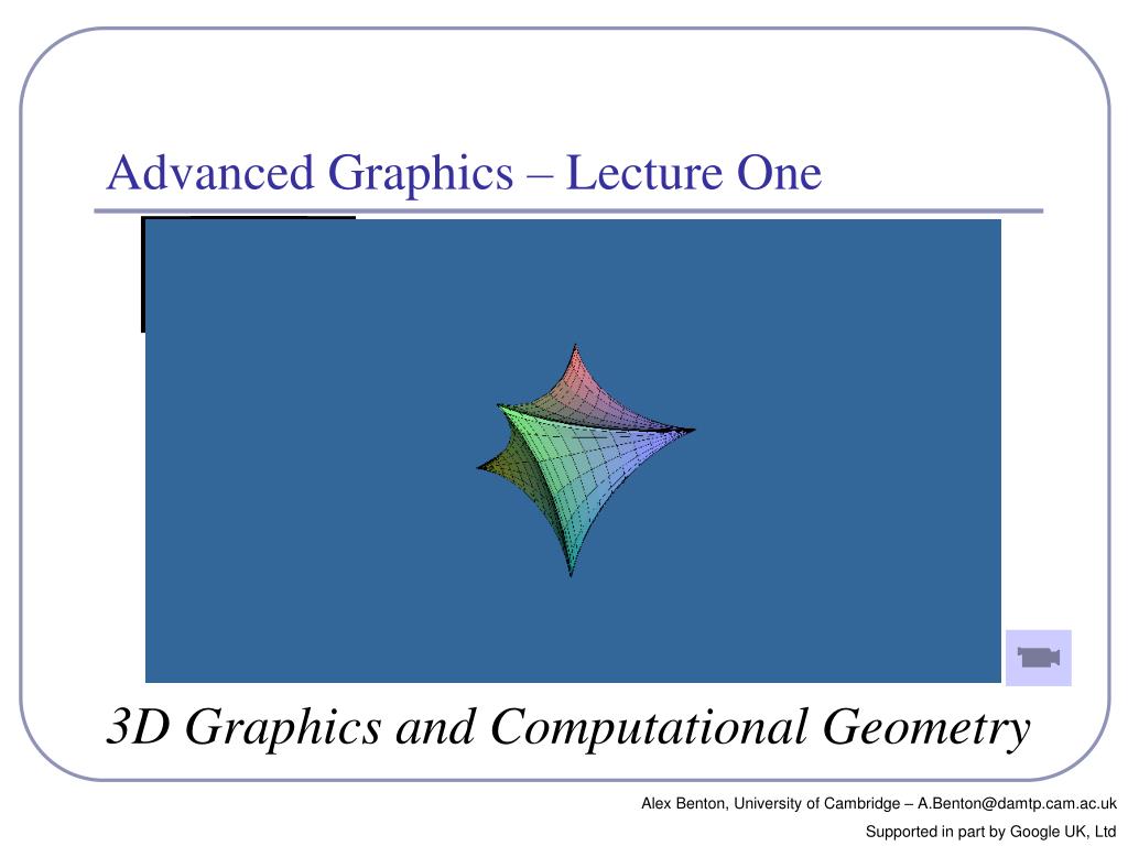 Advanced Graphics – Lecture One 3D Graphics and Computational Geometry Alex Benton, University of Cambridge – A.Benton@damtp.cam.ac.uk Supported in part by Google UK, Ltd