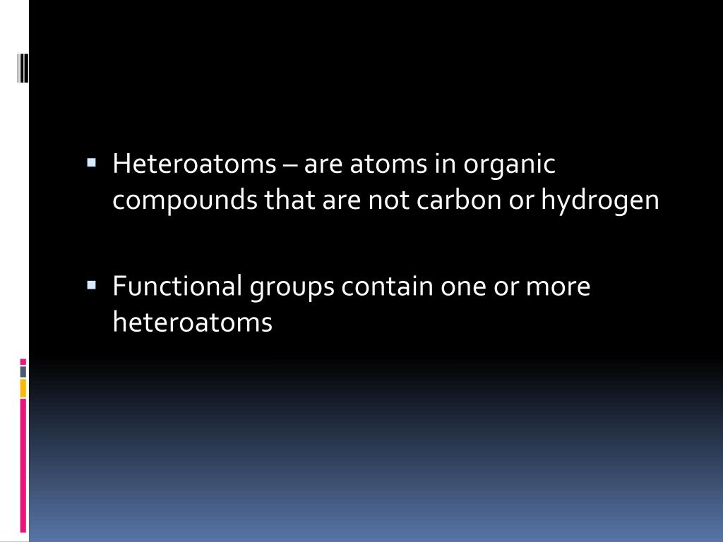 Heteroatoms – are atoms in organic compounds that are not carbon or hydrogen • Functional groups contain one or more heteroatoms