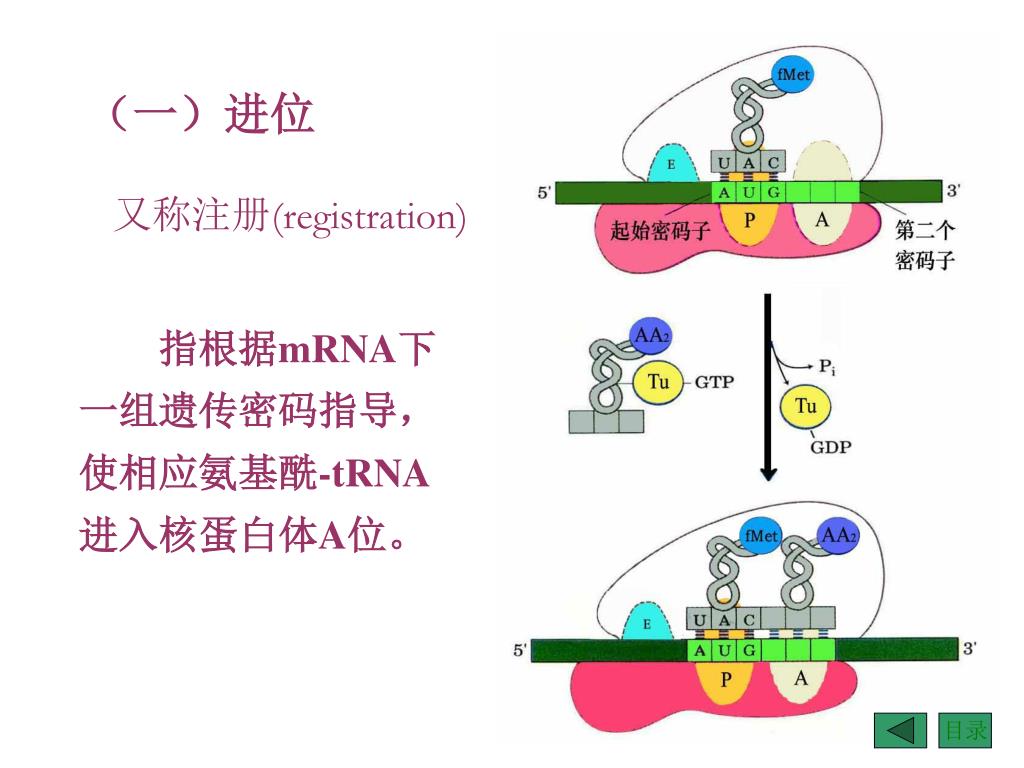 又称注册(registration) (一)进位 指根据mRNA下一组遗传密码指导,使相应氨基酰-tRNA进入核蛋白体A位。 目录
