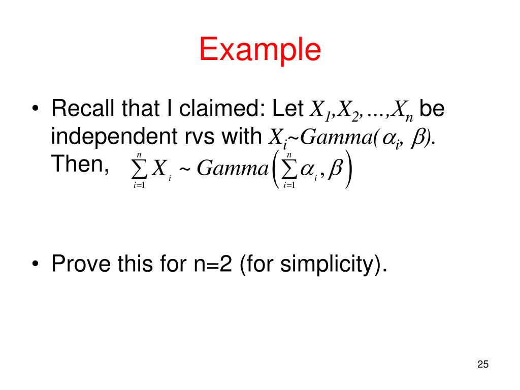 Example • Recall that I claimed: Let X1,X2,…,Xn be independent rvs with Xi~Gamma(i, ). Then, • Prove this for n=2 (for simplicity).