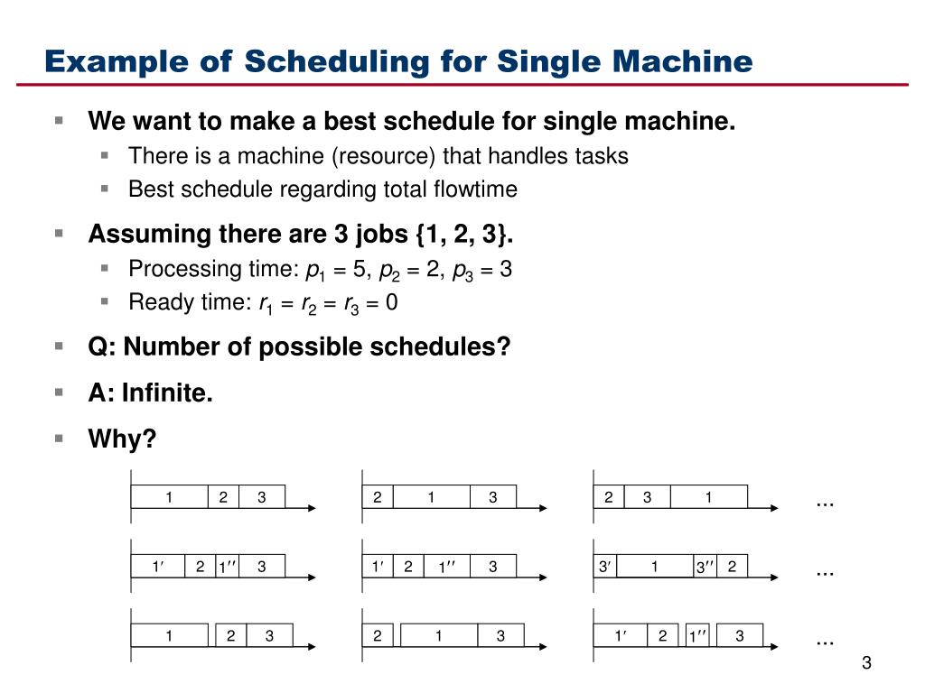 ... 1 2 3 2 1 3 2 3 1 ... 1 2 1 3 1 2 1 3 3 1 3 2 ... 1 2 3 2 1 3 1 2 1 3 Example of Scheduling for Single Machine • We want to make a best schedule for single machine. • There is a machine (resource) that handles tasks • Best schedule regarding total flowtime • Assuming there are 3 jobs {1, 2, 3}. • Processing time: p1 = 5, p2 = 2, p3 = 3 • Ready time: r1 = r2 = r3 = 0 • Q: Number of possible schedules? • A: Infinite. • Why?
