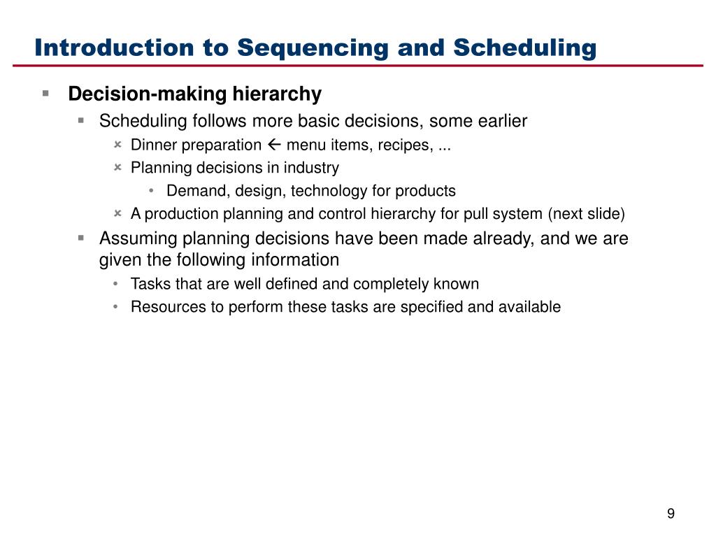 Introduction to Sequencing and Scheduling • Decision-making hierarchy • Scheduling follows more basic decisions, some earlier • Dinner preparation menu items, recipes, ... • Planning decisions in industry • Demand, design, technology for products • A production planning and control hierarchy for pull system (next slide) • Assuming planning decisions have been made already, and we are given the following information • Tasks that are well defined and completely known • Resources to perform these tasks are specified and available