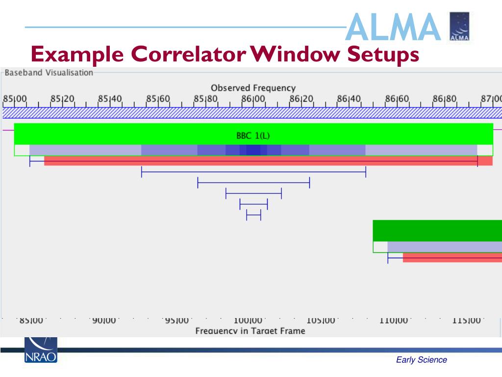 Example Correlator Window Setups Four 2 GHz windows, B3. Then zoom in on BBC1. Early Science