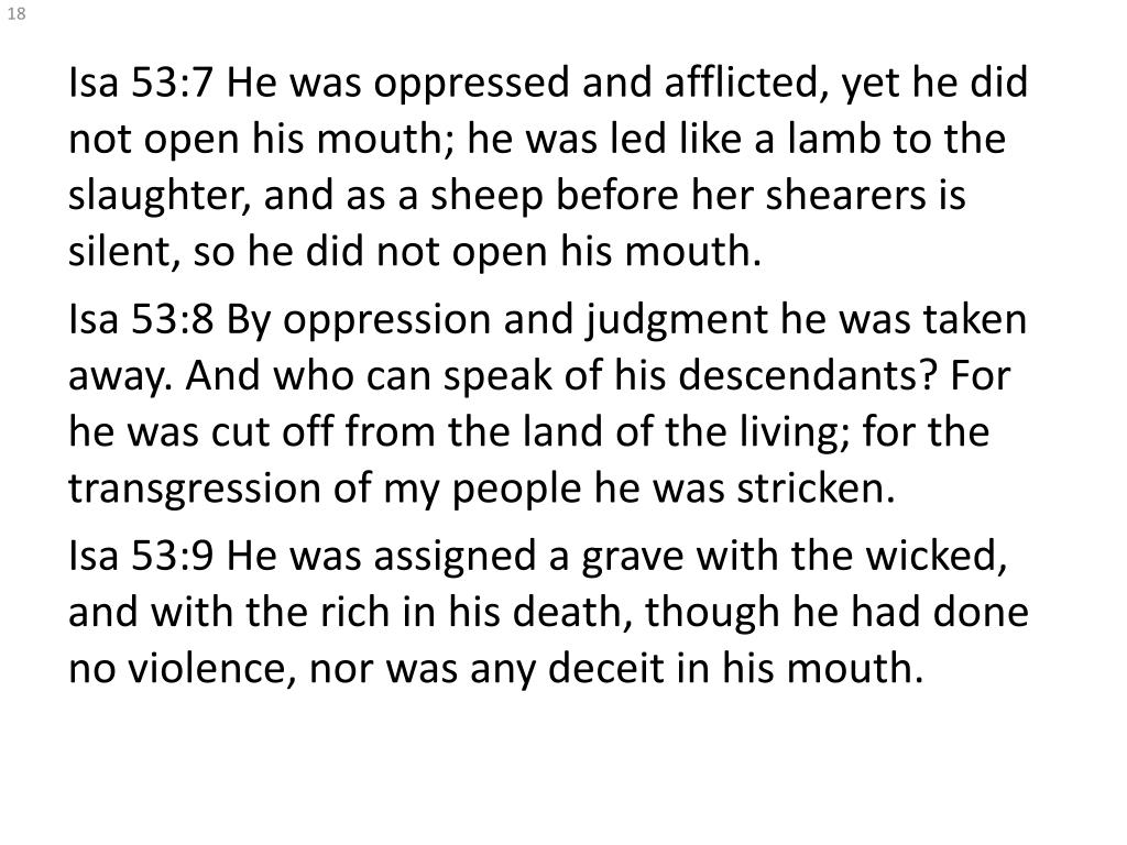 Isa 53:7 He was oppressed and afflicted, yet he did not open his mouth; he was led like a lamb to the slaughter, and as a sheep before her shearers is silent, so he did not open his mouth. Isa 53:8 By oppression and judgment he was taken away. And who can speak of his descendants? For he was cut off from the land of the living; for the transgression of my people he was stricken. Isa 53:9 He was assigned a grave with the wicked, and with the rich in his death, though he had done no violence, nor was any deceit in his mouth.