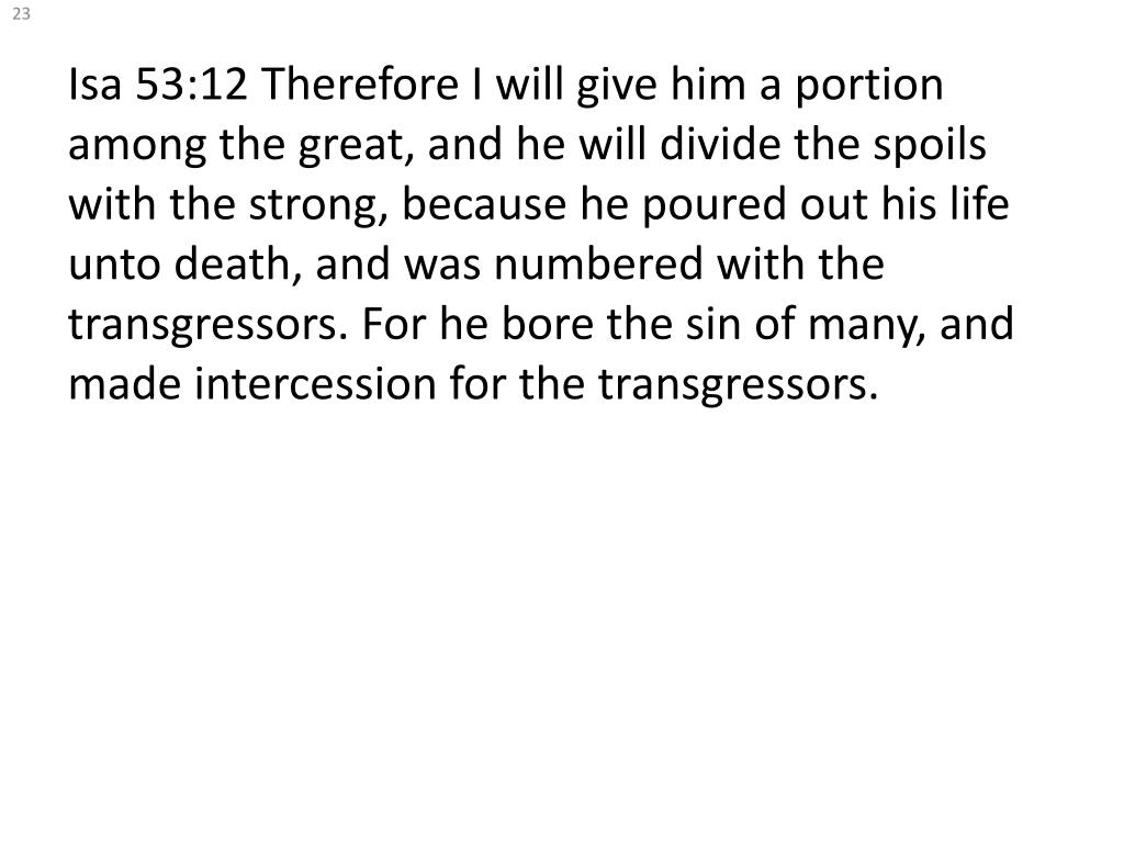 Isa 53:12 Therefore I will give him a portion among the great, and he will divide the spoils with the strong, because he poured out his life unto death, and was numbered with the transgressors. For he bore the sin of many, and made intercession for the transgressors.