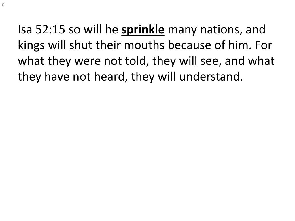Isa 52:15 so will he sprinkle many nations, and kings will shut their mouths because of him. For what they were not told, they will see, and what they have not heard, they will understand.