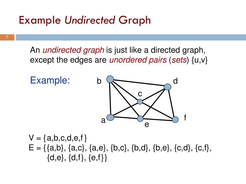 Example Undirected Graph An undirected graphis just like a directed graph, except the edges are unordered pairs (sets) {u,v} Example: b d c f a e V = {a,b,c,d,e,f} E = {{a,b}, {a,c}, {a,e}, {b,c}, {b,d}, {b,e}, {c,d}, {c,f}, {d,e}, {d,f}, {e,f}}