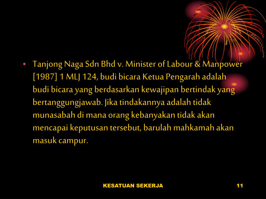 Tanjong Naga Sdn Bhd v. Minister of Labour & Manpower [1987] 1 MLJ 124, budi bicara Ketua Pengarah adalah budi bicara yang berdasarkan kewajipan bertindak yang bertanggungjawab. Jika tindakannya adalah tidak munasabah di mana orang kebanyakan tidak akan mencapai keputusan tersebut, barulah mahkamah akan masuk campur. KESATUAN SEKERJA