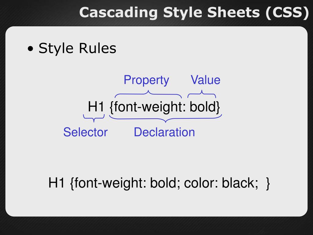 Cascading Style Sheets (CSS) • Style Rules Property Value H1 {font-weight: bold} Selector Declaration H1 {font-weight: bold; color: black; }