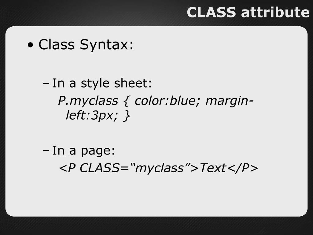 CLASS attribute • Class Syntax: • In a style sheet: P.myclass { color:blue; margin-left:3px; } • In a page: <P CLASS=“myclass”>Text</P>