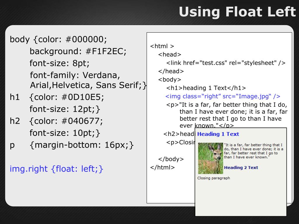 Using Clear body {color: #000000; background: #F1F2EC; font-size: 8pt; font-family: Verdana, Arial,Helvetica, Sans Serif;} h1 {color: #0D10E5; font-size: 12pt;} h2 {color: #040677; font-size: 10pt;} p {margin-bottom: 16px;} img.right {float: left;} <html > <head> <link href="test.css" rel="stylesheet" /> </head> <body> <h1>heading 1 Text</h1> <img class=“right” src=“Image.jpg“ /> <p>"It is a far, far better thing that I do, than I have ever done; it is a far, far better rest that I go to than I have ever known."</p> <h2>heading 2 Text</h2> <p>Closing paragraph</p> </body> </html>