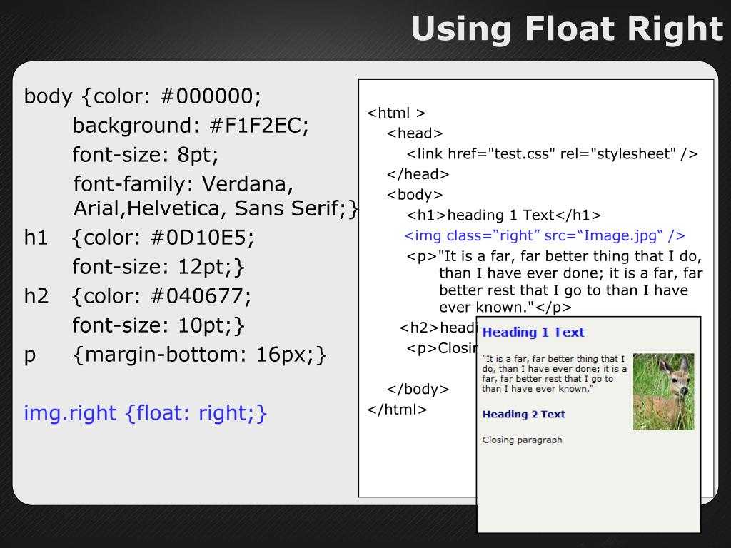 Using Float Right body {color: #000000; background: #F1F2EC; font-size: 8pt; font-family: Verdana, Arial,Helvetica, Sans Serif;} h1 {color: #0D10E5; font-size: 12pt;} h2 {color: #040677; font-size: 10pt;} p {margin-bottom: 16px;} img.right {float: right;} <html > <head> <link href="test.css" rel="stylesheet" /> </head> <body> <h1>heading 1 Text</h1> <img class=“right” src=“Image.jpg“ /> <p>"It is a far, far better thing that I do, than I have ever done; it is a far, far better rest that I go to than I have ever known."</p> <h2>heading 2 Text</h2> <p>Closing paragraph</p> </body> </html>
