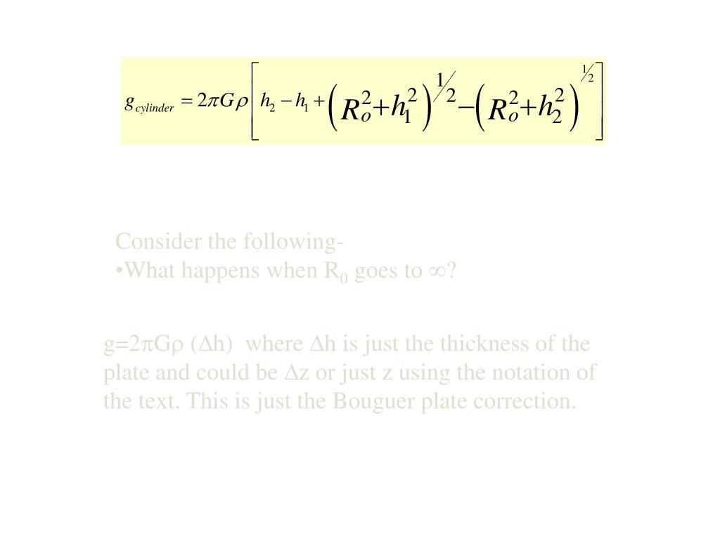 Consider the following- • What happens when R0 goes to ? g=2G (h) where h is just the thickness of the plate and could be z or just z using the notation of the text. This is just the Bouguer plate correction.