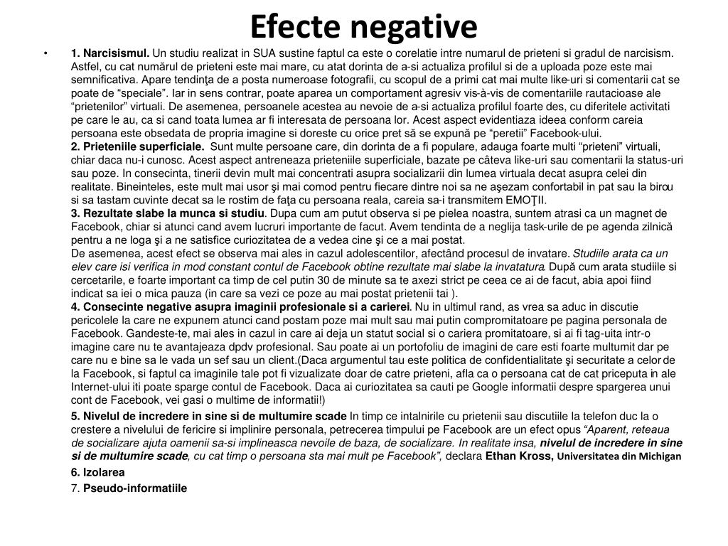Efecte negative • 1. Narcisismul. Un studiu realizat in SUA sustine faptul ca este o corelatie intre numarul de prieteni si gradul de narcisism. Astfel, cu cat numărul de prieteni este mai mare, cu atat dorinta de a-si actualiza profilul si de a uploada poze este mai semnificativa. Apare tendinţa de a posta numeroase fotografii, cu scopul de a primi cat mai multe like-uri si comentarii cat se poate de “speciale”. Iar in sens contrar, poate aparea un comportament agresiv vis-à-vis de comentariile rautacioase ale “prietenilor” virtuali. De asemenea, persoanele acestea au nevoie de a-si actualiza profilul foarte des, cu diferitele activitati pe care le au, ca si cand toata lumea ar fi interesata de persoana lor. Acest aspect evidentiaza ideea conform careia persoana este obsedata de propria imagine si doreste cu orice pret să se expună pe “peretii” Facebook-ului.2. Prieteniile superficiale. Sunt multe persoane care, din dorinta de a fi populare, adauga foarte multi “prieteni” virtuali, chiar daca nu-i cunosc. Acest aspect antreneaza prieteniile superficiale, bazate pe câteva like-uri sau comentarii la status-uri sau poze. In consecinta, tinerii devin mult mai concentrati asupra socializarii din lumea virtuala decat asupra celei din realitate. Bineinteles, este mult mai usor şi mai comod pentru fiecare dintre noi sa ne aşezam confortabil in pat sau la birou si sa tastam cuvinte decat sa le rostim de faţa cu persoana reala, careia sa-i transmitem EMOŢII.3. Rezultate slabe la munca si studiu. Dupa cum am putut observa si pe pielea noastra, suntem atrasi ca un magnet de Facebook, chiar si atunci cand avem lucruri importante de facut. Avem tendinta de a neglija task-urile de pe agenda zilnică pentru a ne loga şi a ne satisfice curiozitatea de a vedea cine şi ce a mai postat.De asemenea, acest efect se observa mai ales in cazul adolescentilor, afectând procesul de invatare. Studiile arata ca un elev care isi verifica in mod constant contul de Facebook obtine rezultate mai slabe la invatatura. După cum arata studiile si cercetarile, e foarte important ca timp de cel putin 30 de minute sa te axezi strict pe ceea ce ai de facut, abia apoi fiind indicat sa iei o mica pauza (in care sa vezi ce poze au mai postat prietenii tai ).4. Consecinte negative asupra imaginii profesionale si a carierei. Nu in ultimul rand, as vrea sa aduc in discutie pericolele la care ne expunem atunci cand postam poze mai mult sau mai putin compromitatoare pe pagina personala de Facebook. Gandeste-te, mai ales in cazul in care ai deja un statut social si o cariera promitatoare, si ai fi tag-uita intr-o imagine care nu te avantajeaza dpdv profesional. Sau poate ai un portofoliu de imagini de care esti foarte multumit dar pe care nu e bine sa le vada un sef sau un client.(Daca argumentul tau este politica de confidentialitate şi securitate a celor de la Facebook, si faptul ca imaginile tale pot fi vizualizate doar de catre prieteni, afla ca o persoana cat de cat priceputa in ale Internet-ului iti poate sparge contul de Facebook. Daca ai curiozitatea sa cauti pe Google informatii despre spargerea unui cont de Facebook, vei gasi o multime de informatii!) 5. Nivelul de incredere in sine si de multumire scade In timp ce intalnirile cu prietenii sau discutiile la telefon duc la o crestere a nivelului de fericire si implinire personala, petrecerea timpului pe Facebook are un efect opus “Aparent, reteaua de socializare ajuta oamenii sa-si implineasca nevoile de baza, de socializare. In realitate insa, nivelul de incredere in sine si de multumire scade, cu cat timp o persoana sta mai mult pe Facebook”, declara Ethan Kross,Universitatea din Michigan 6. Izolarea 7. Pseudo-informatiile