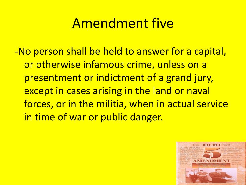 Amendment five -No person shall be held to answer for a capital, or otherwise infamous crime, unless on a presentment or indictment of a grand jury, except in cases arising in the land or naval forces, or in the militia, when in actual service in time of war or public danger.